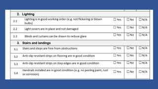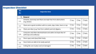 This document outlines the five steps to conducting a risk assessment: 1) identify hazards, 2) decide who may be harmed and how, 3) assess the risks and take action, 4) make a record of findings, and 5) review the risk assessment. It then provides tables to guide rating the likelihood, consequences, control effectiveness, and trend of identified risks. Risks should be documented along with the responsible person, likelihood and consequence scores, current control measures, and effectiveness of controls.