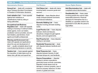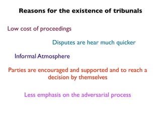 The Victorian Civil and Administrative Tribunal (VCAT) was established in 1998 to replace different tribunals. VCAT has three divisions: Civil, Human Rights, and Administration. It hears a wide range of disputes more quickly and at a lower cost than courts through an informal process. While tribunals provide expertise and encourage alternative dispute resolution, their decisions have limited appeal and informal processes may not be suitable for large civil disputes.