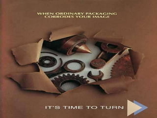 The document discusses a company that provides packaging solutions and corrosion prevention products. It aims to become a world-class high-tech packaging provider. The company has over 50 years of experience in the industry and collaborates with customers and global partners. It offers various corrosion prevention products like VCI papers, films, powders, and tablets that form a protective barrier on metals to prevent corrosion through vapor and direct contact.