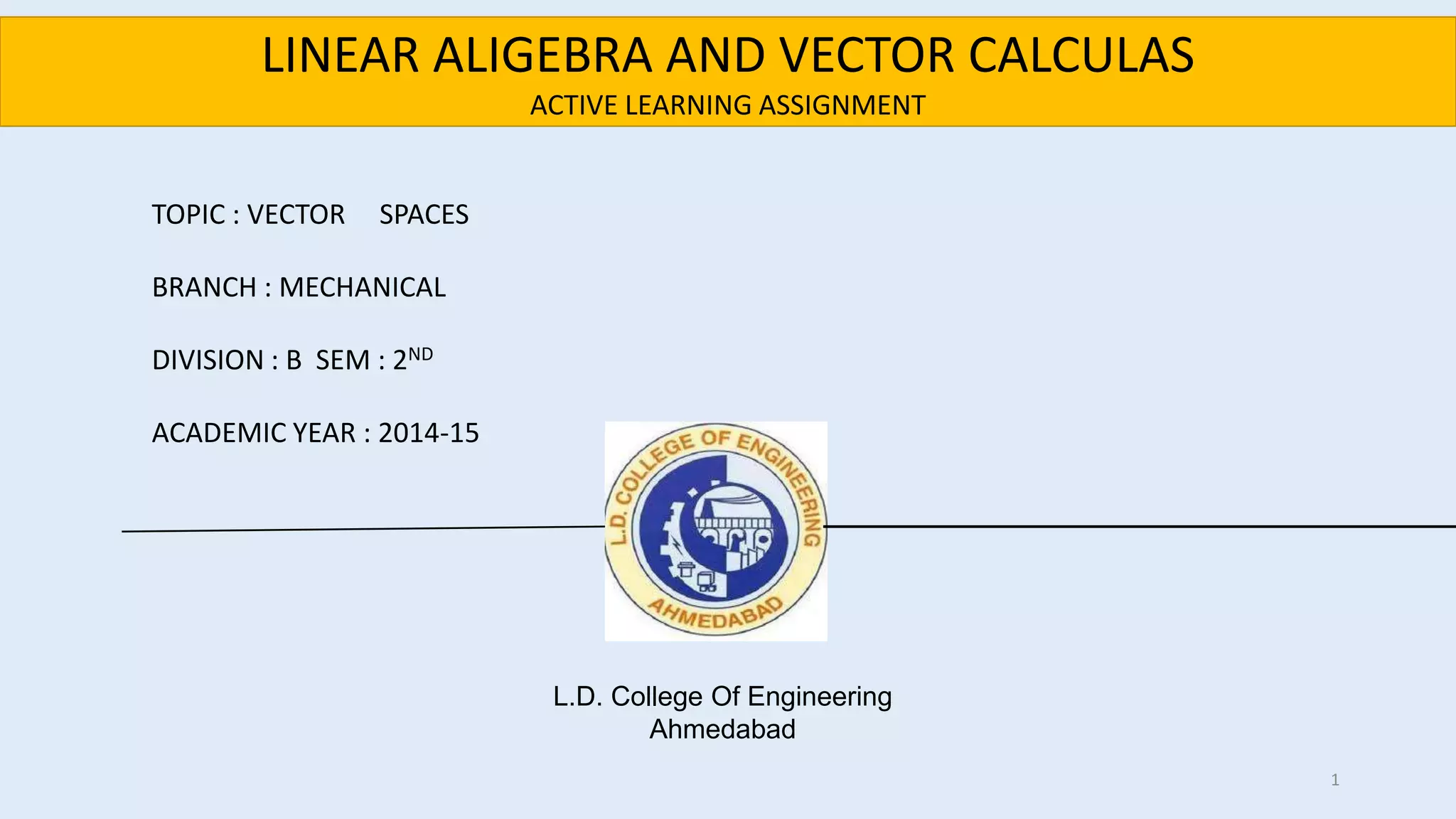 The document provides information about a linear algebra and vector calculus assignment for mechanical engineering students at L.D. College of Engineering in Ahmedabad, India. It includes the names of 10 students, an outline of 8 topics to be covered, and sample definitions, examples, and explanations related to those topics, such as definitions of vector spaces and subspaces, linear combinations, linear independence, and span of a set of vectors.