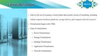 Virtualization refers to creating virtual versions of hardware and resources rather than actual physical versions. There are several types of virtualization including server, storage, desktop, application, and network virtualization. Server virtualization partitions physical servers into smaller virtual servers to maximize resource use. There are two main approaches to full virtualization: software-assisted which uses binary translation, and hardware-assisted which uses virtualization technology in Intel/AMD CPUs. Paravirtualization modifies guest operating systems to communicate directly with the hypervisor rather than simulating hardware. Hybrid virtualization uses paravirtualization for drivers and full virtualization for other features.