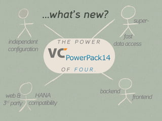 The vcpowerpack14 introduces an independent configuration allowing users to create specifications without business context, significantly accelerating data access and reducing hardware load compared to previous versions. It features an XML-based dynamic index database for parameter storage and expands integration capabilities with various systems, including web and mobile access. The solution is fully compatible with SAP's HANA platform, enhancing real-time processing and offering cross-plant configuration management.