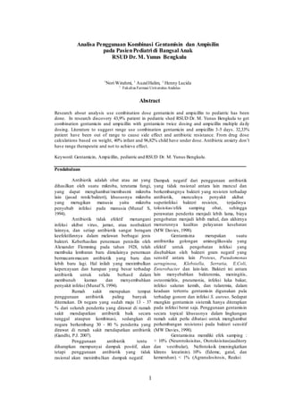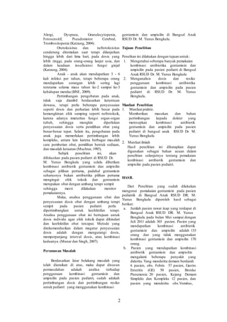 Penelitian ini menganalisis penggunaan kombinasi antibiotik gentamisin dan ampisilin pada pasien pediatri di RSUD Dr. M. Yunus Bengkulu, dengan temuan bahwa 43,9% pasien menerima kombinasi ini, namun 32,33% berada di luar rentang dosis yang dianjurkan, meningkatkan risiko efek samping dan resistensi antibiotik. Dosis yang diberikan juga menunjukkan bahwa 40% bayi dan 96,82% anak-anak menerima dosis di bawah yang disarankan. Penelitian ini menekankan pentingnya penyesuaian dosis dan pemantauan penggunaan untuk menghindari efek toksik dan memastikan efektivitas terapi.