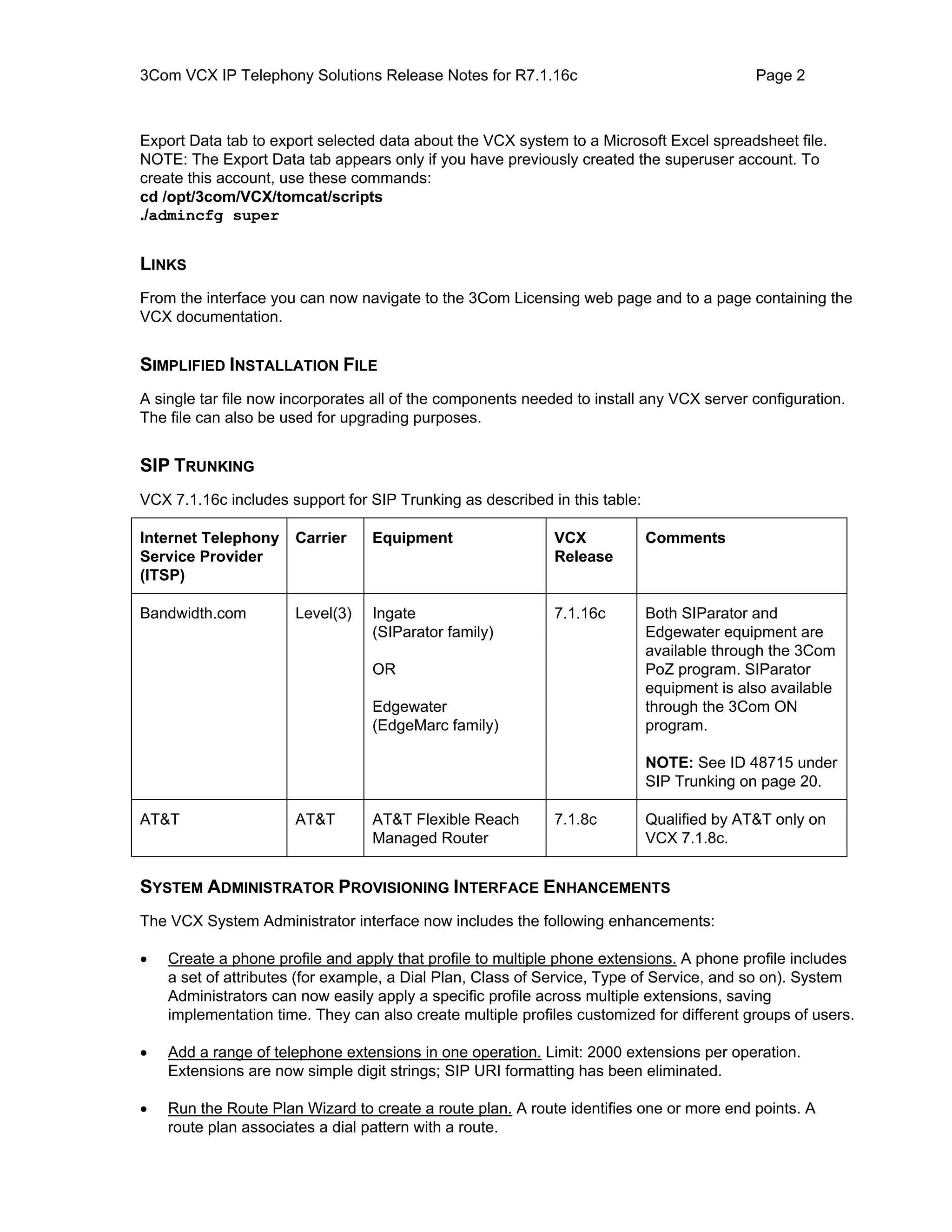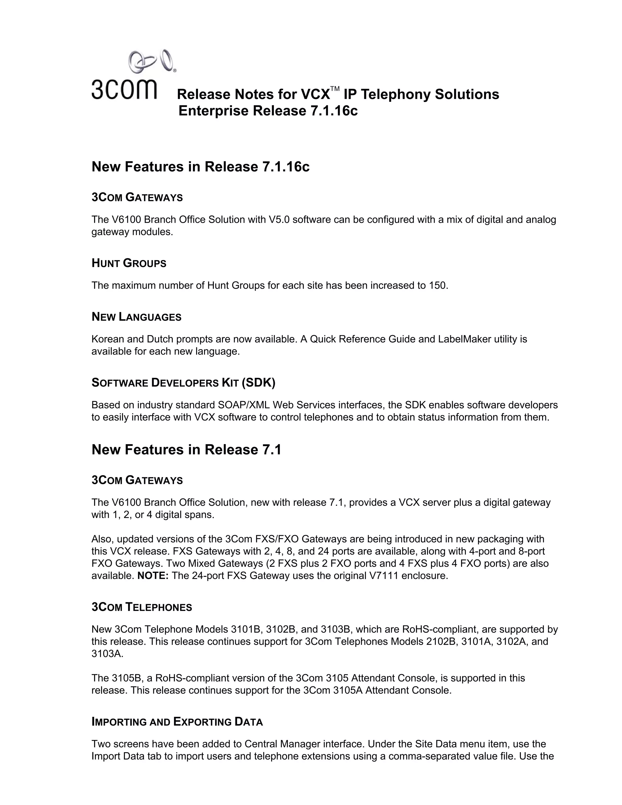 This document provides release notes for VCX IP Telephony Solutions Release 7.1.16c. Key updates include increased hunt group and paging group member limits, new phone models, SIP trunking support, improved provisioning interfaces, backup/restore functionality, and fixes to call processing and caller ID issues. The release adds features like call monitoring, call waiting configuration, and selective ringing. It also upgrades supported 3Com gateway, conferencing, and attendant console applications.