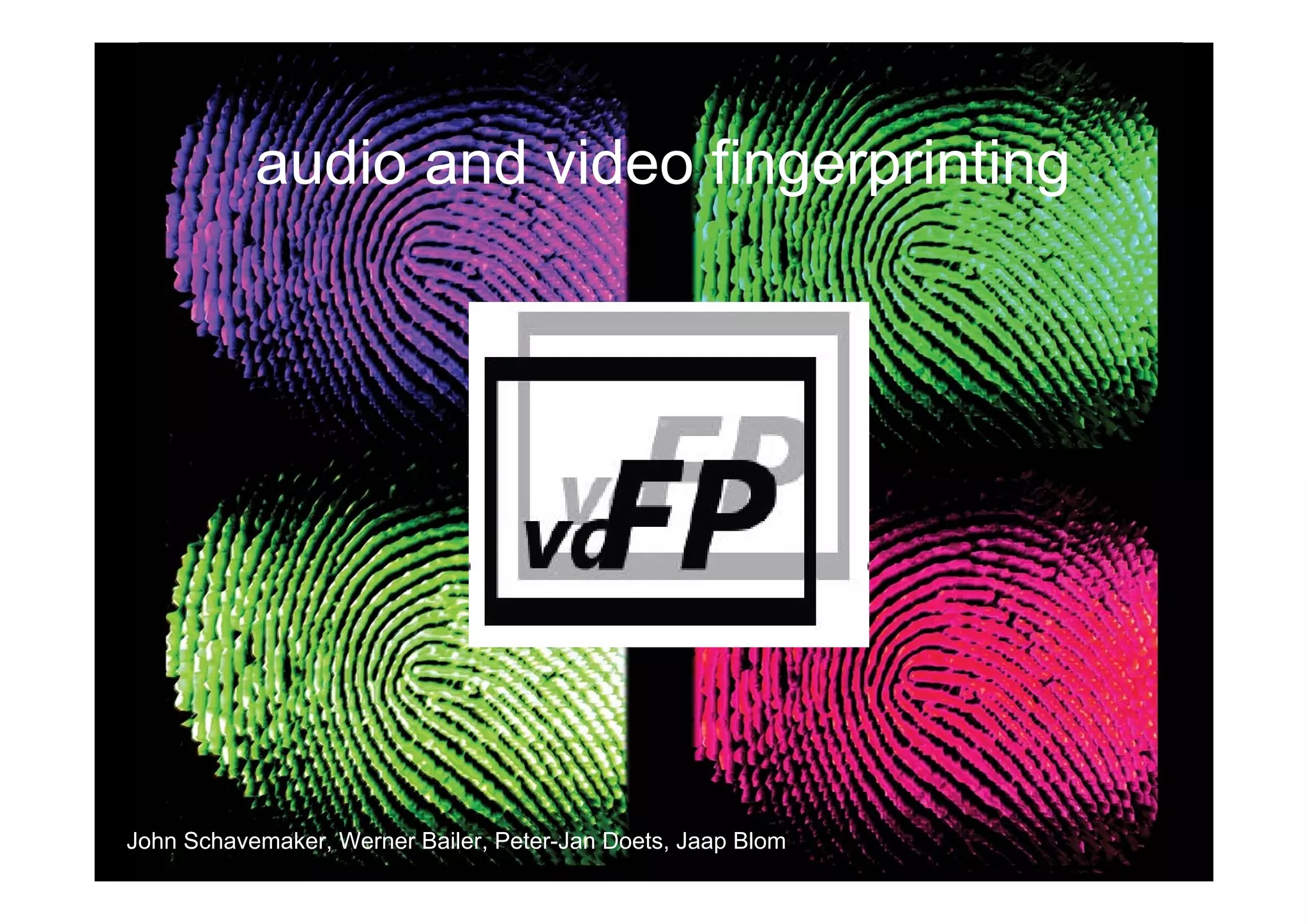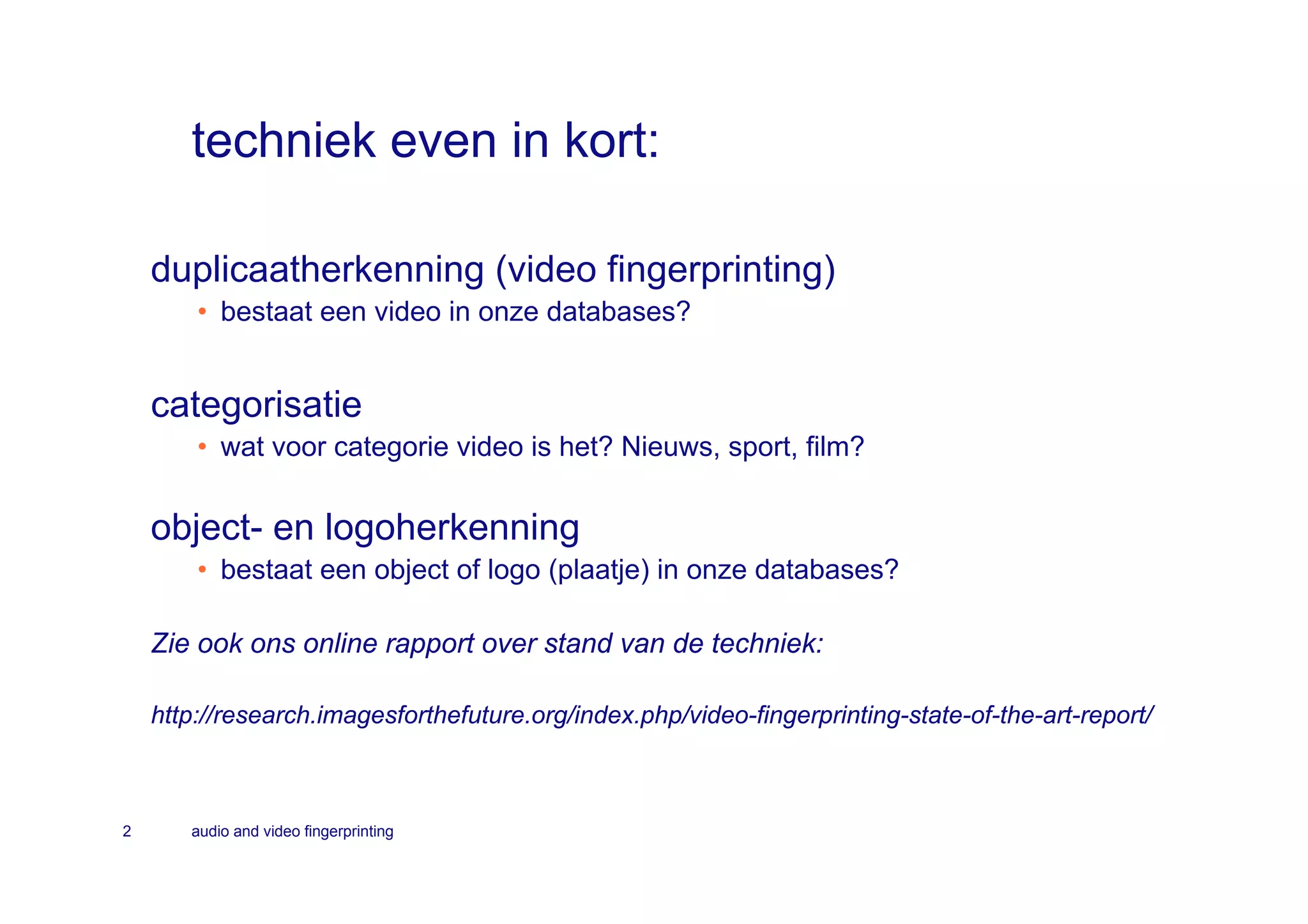 The document discusses audio and video fingerprinting techniques. It describes duplication recognition, categorization, and object/logo recognition as the main applications. It provides strengths, weaknesses, opportunities, and threats analyses for each application. It also summarizes preliminary results from experiments applying these techniques to a dataset from a Dutch television archive. Key challenges included transformations to videos, the diversity of content, and limitations of current commercial tools for this type of archival material.