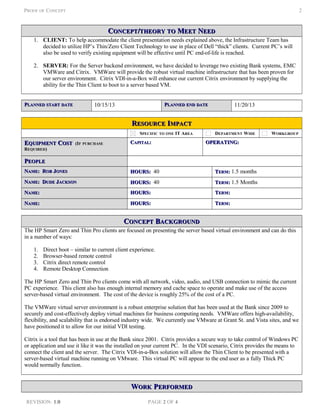 This document proposes a proof of concept for a virtual desktop infrastructure (VDI) using thin clients. It involves using HP thin/zero clients connected to a backend server environment running VMware and Citrix. The goals are to increase flexibility, availability, and extend the life of existing PCs by moving computing resources to a centralized server. A 2-person team will demo connecting thin clients and older PCs to pooled or dedicated virtual machines to prove the viability of the concept.