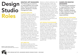 The document outlines various roles in graphic design studios, including positions such as creative director, art director, graphic designer, and multimedia developer, along with their responsibilities and skills. It also discusses the importance of diverse thinking styles in digital agencies and the differentiation between task and nurturing roles within teams. Additionally, the document emphasizes the significance of collaboration and effective communication for achieving team success in creative environments.