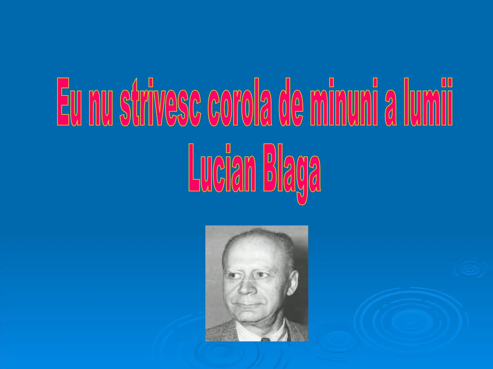 Lucian Blaga, o personalitate proeminentă a culturii interbelice românești, a fost filosof, scriitor și profesor, având un impact semnificativ prin originalitatea sa. Născut în 1895, a studiat teologia și filosofia, având o carieră diversificată ca redactor și diplomat, iar în 1939 a devenit profesor de filosofia culturii. Poezia sa "Eu nu strivesc corola de minuni a lumii" este un manifest literar ce explorează misterele existenței și cunoașterea prin iubire, reflectând simultan influențe expresioniste și o dorință profundă de a păstra taina universului.