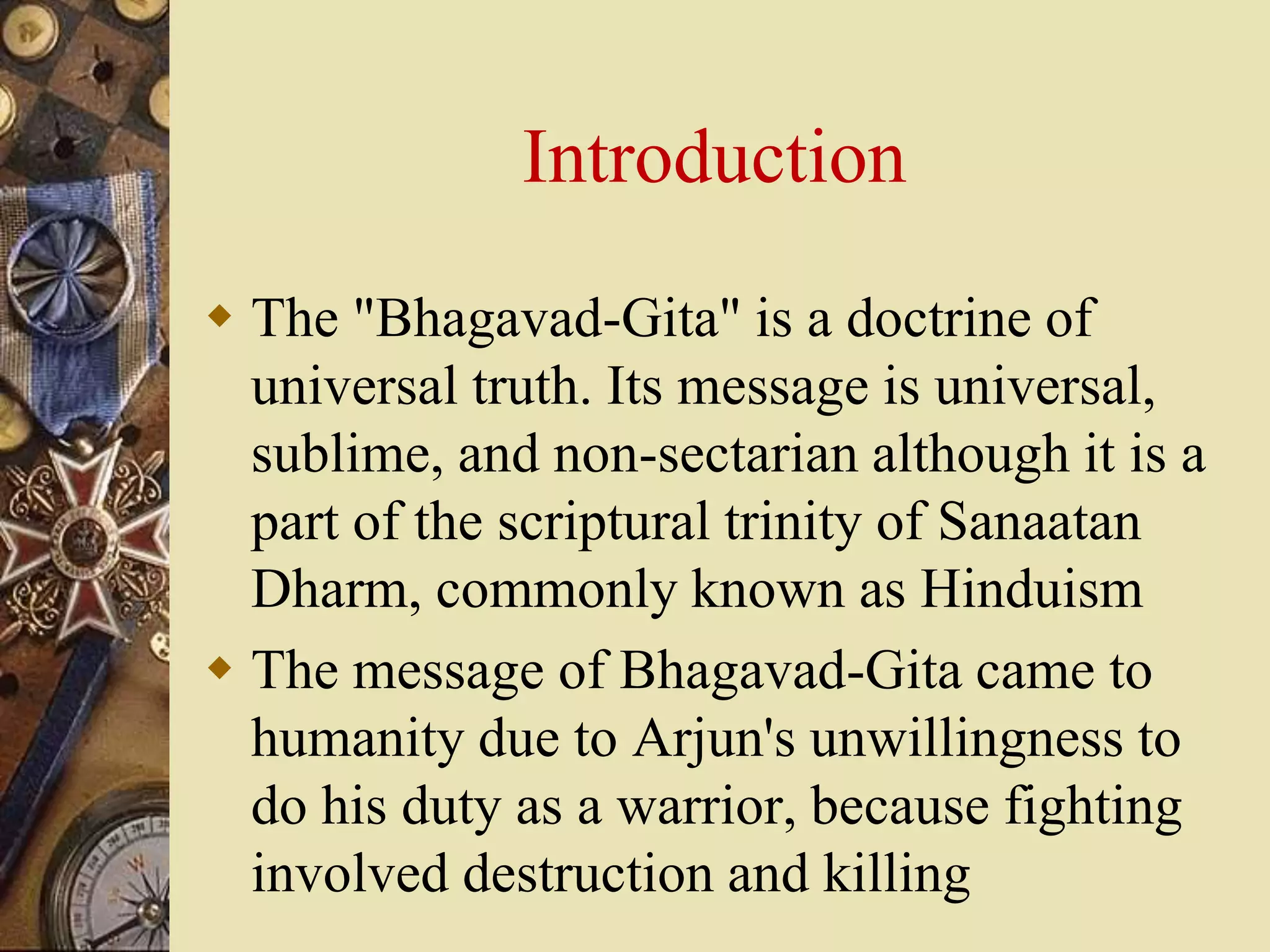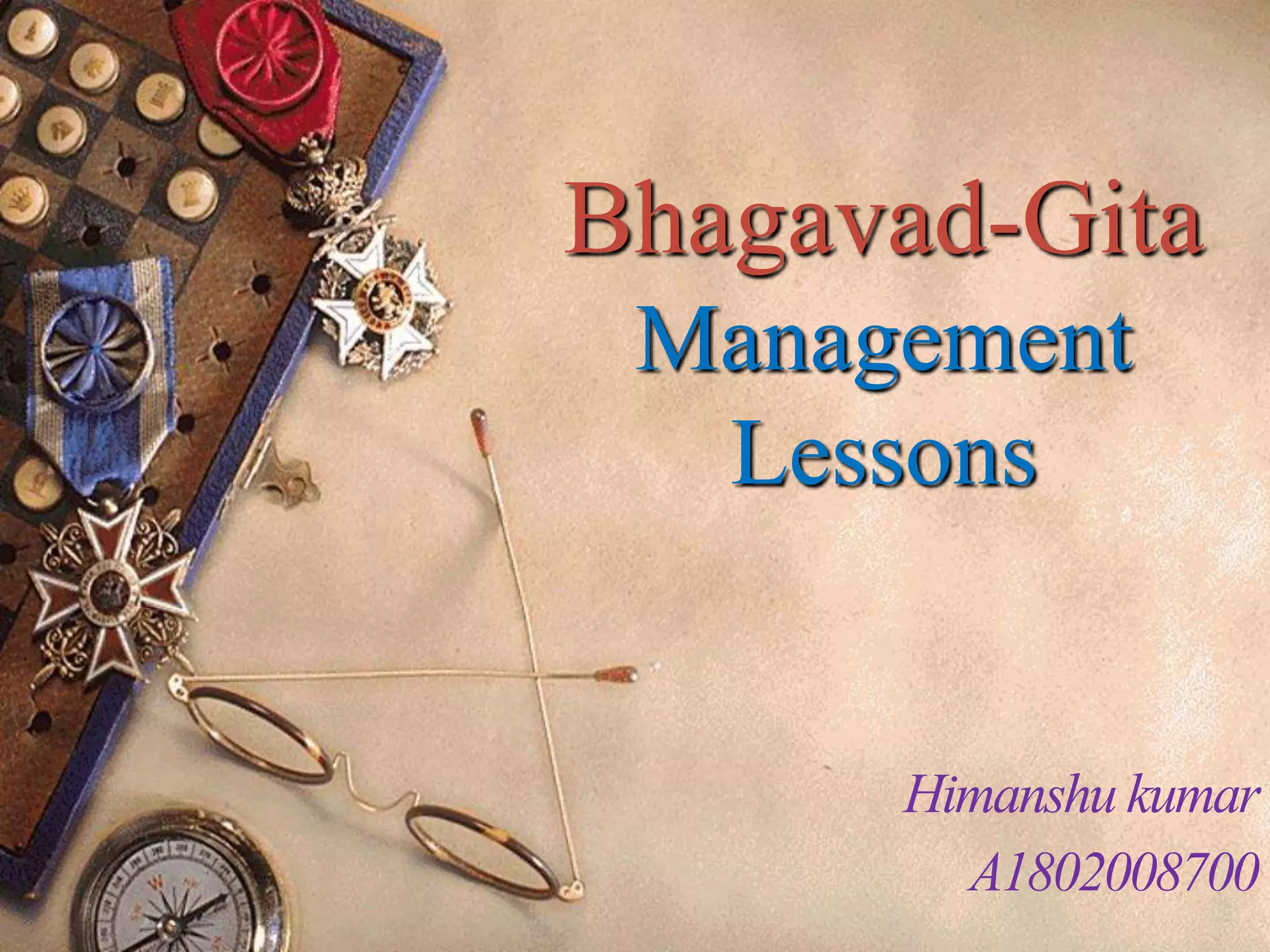 The document summarizes key lessons on management that can be learned from the Bhagavad Gita. It discusses concepts like leadership, motivation, work commitment, developing human resources, managerial skills, the way of knowledge, meditation, and vision and planning. For example, it states that the Gita talks about the purpose of life and self-realization and that a leader must be visionary and seek progress. It also emphasizes unselfish work without desire for rewards and controlling the senses and mind through knowledge.