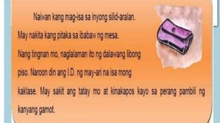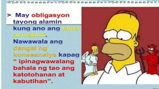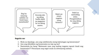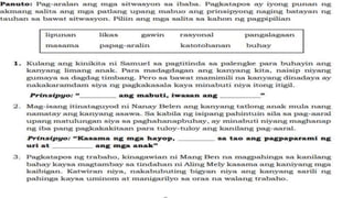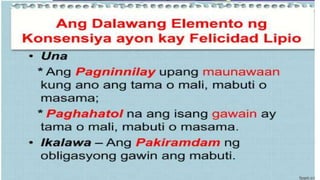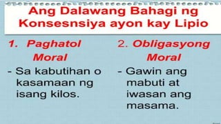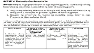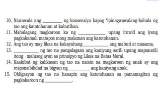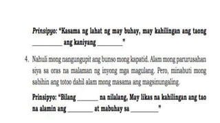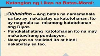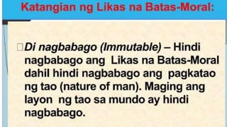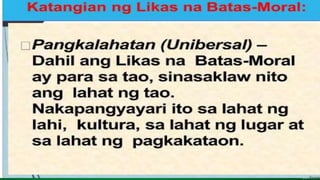 Ang dokumento ay naglalaman ng mga prinsipyo ng likas na batas moral, na nagsasaad ng mga obligasyon ng tao na gumawa ng mabuti at iwasan ang masama, kasama na ang pag-aalaga sa sariling buhay, pagpaparami at paghubog ng mga anak, at paghahanap ng katotohanan. Binibigyang-diin nito ang kahalagahan ng wastong kumilos, pagkilala sa mga tunay na halaga, at paggalang sa dignidad ng tao, na may batayan sa batas na walang hanggan at batas moral. Ang mga prinsipyo ito ay mahalaga sa pagbuo ng magandang relasyon sa kapwa at pagpapalaganap ng mabuting asal sa lipunan.