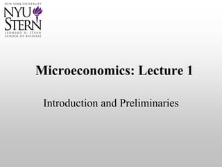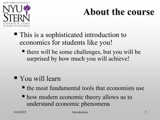 This document provides an introduction to a microeconomics course. It outlines that students will learn fundamental economic tools and analysis. The course consists of lectures introducing concepts and problem sets discussed in recitation. Topics to be covered include positive and normative analysis, market definition, and the consumer price index (CPI) measure of inflation. Grades are based on problem sets, quizzes, a midterm, and final exam. The introduction concludes with an overview of key microeconomic concepts.