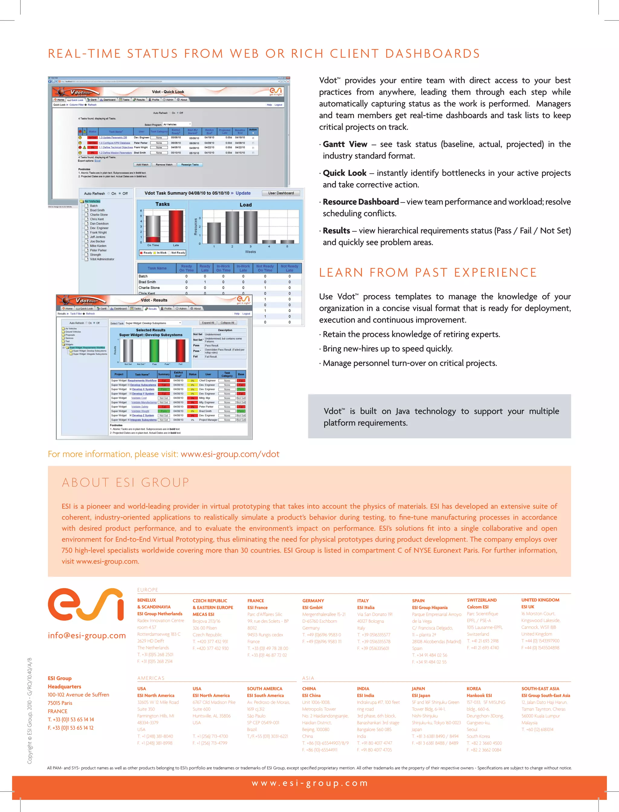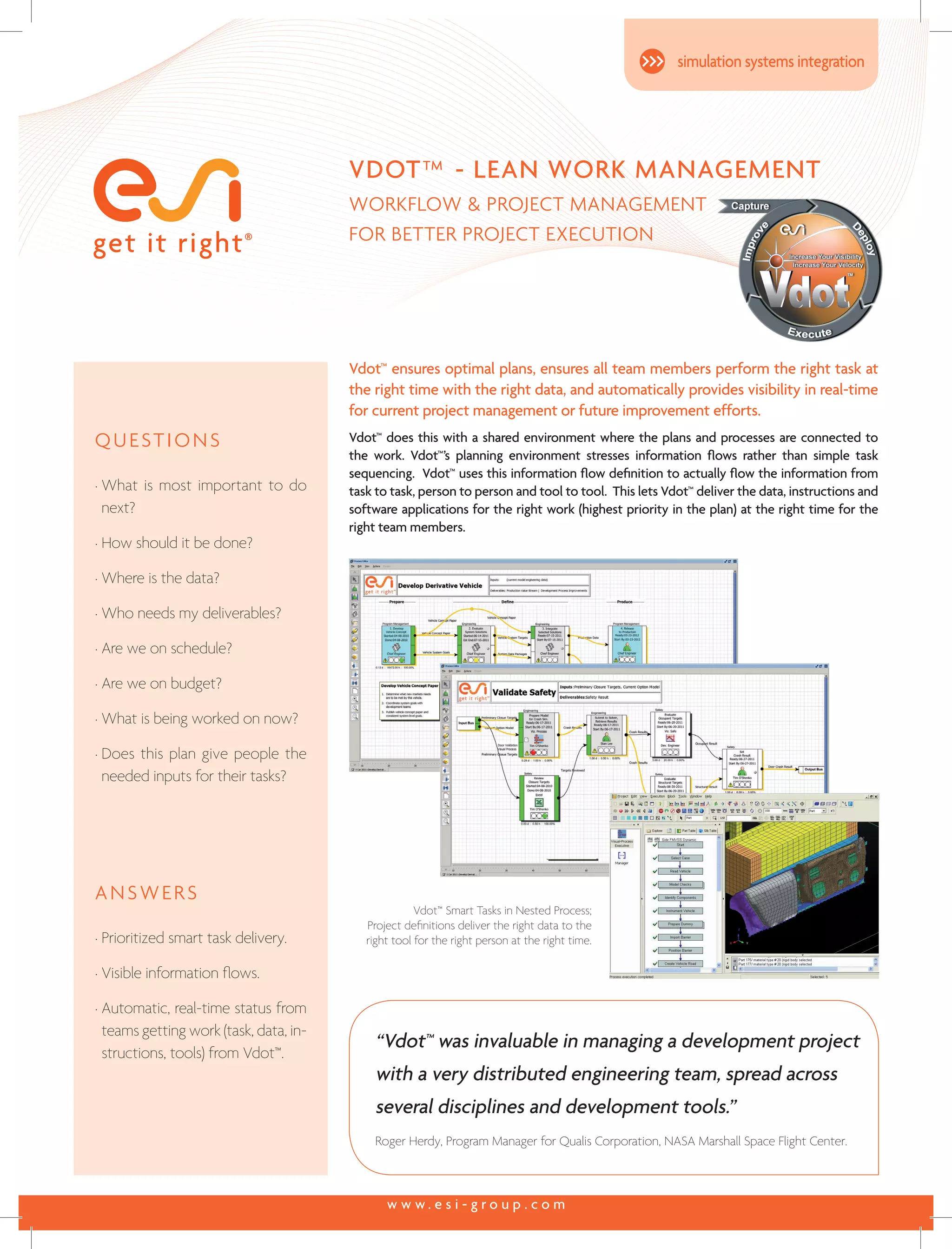 VdotTM is a workflow and project management software that ensures optimal project execution through integrated planning and real-time visibility. It connects project plans and processes to work being performed, using information flows rather than just task sequencing. This allows VdotTM to automatically deliver the right data, instructions, and tools to the correct team members for the highest priority work at the right time.