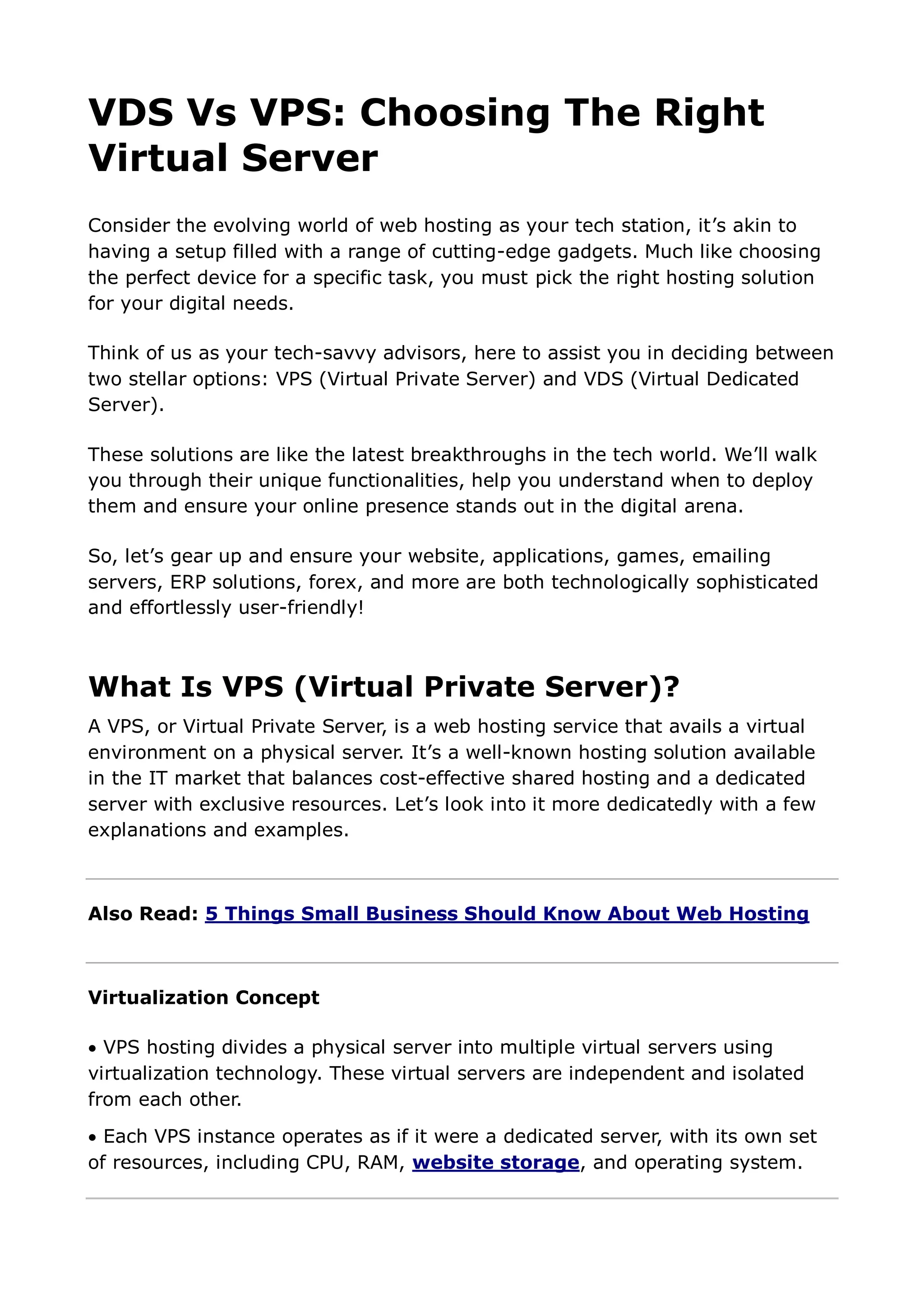 The document compares Virtual Private Servers (VPS) and Virtual Dedicated Servers (VDS), highlighting their functionalities, benefits, and ideal use cases. VPS provides an affordable yet controlled hosting environment suitable for small to medium-sized businesses, while VDS offers dedicated resources for resource-intensive applications, ensuring better performance and security. The choice between VPS and VDS depends on specific requirements, budget, and the level of isolation and control needed.
