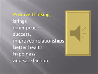 This document provides tips for developing powerful positive thinking. It recommends always using positive words when thinking and speaking, focusing on feelings of happiness and success, disregarding negative thoughts, visualizing successful outcomes before taking action, reading inspirational material daily, associating with positive people, exercising, having good posture, and expecting favorable results even in less than ideal circumstances. Following these suggestions can help prove to yourself the reality of positive thinking's power to change your life.