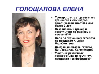 Елена Голощапова является тренером и коучем с более чем 3-летним опытом, проводит тренинги по привлечению клиентов через социальные сети, основываясь на обучении у известных экспертов. Документ обсуждает эффективные методы работы с различными социальными медиа и статистику их использования в России. Участники тренинга получают бонусы, такие как скидки на продукты и бесплатные консультации.