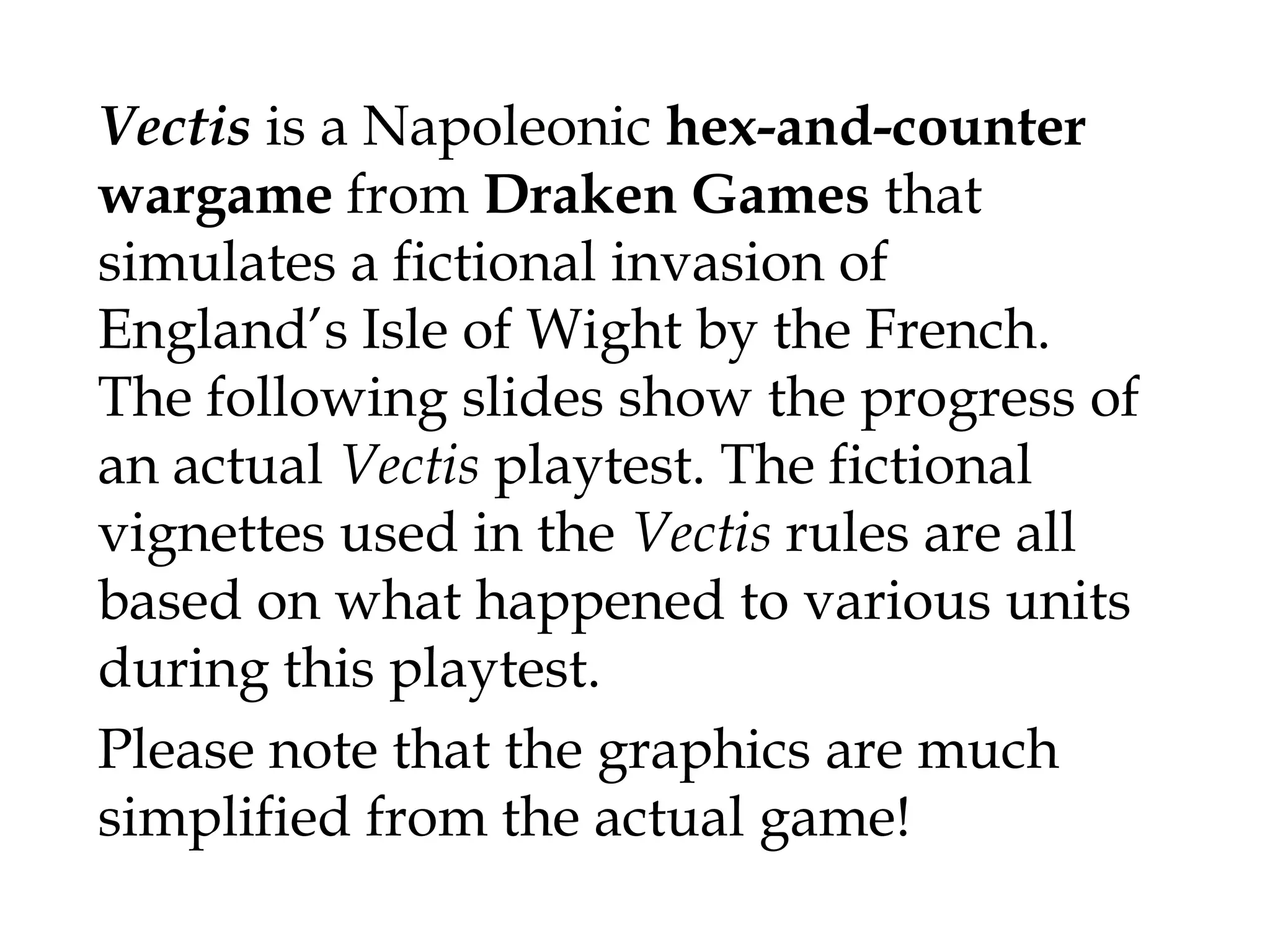 This document provides a playthrough summary of a fictional invasion of the Isle of Wight in the Napoleonic wargame Vectis. Over the course of 12 turns spanning 4 days, French forces land on the island and engage British defensive forces. The French make early gains but the British resistance stiffens. By the fourth day, the French have captured most of the island except for pockets of British resistance, though the British mount a counterattack to retake one position. An epilogue describes the positioning of forces at the start of the fifth day with both sides reinforcing their lines.