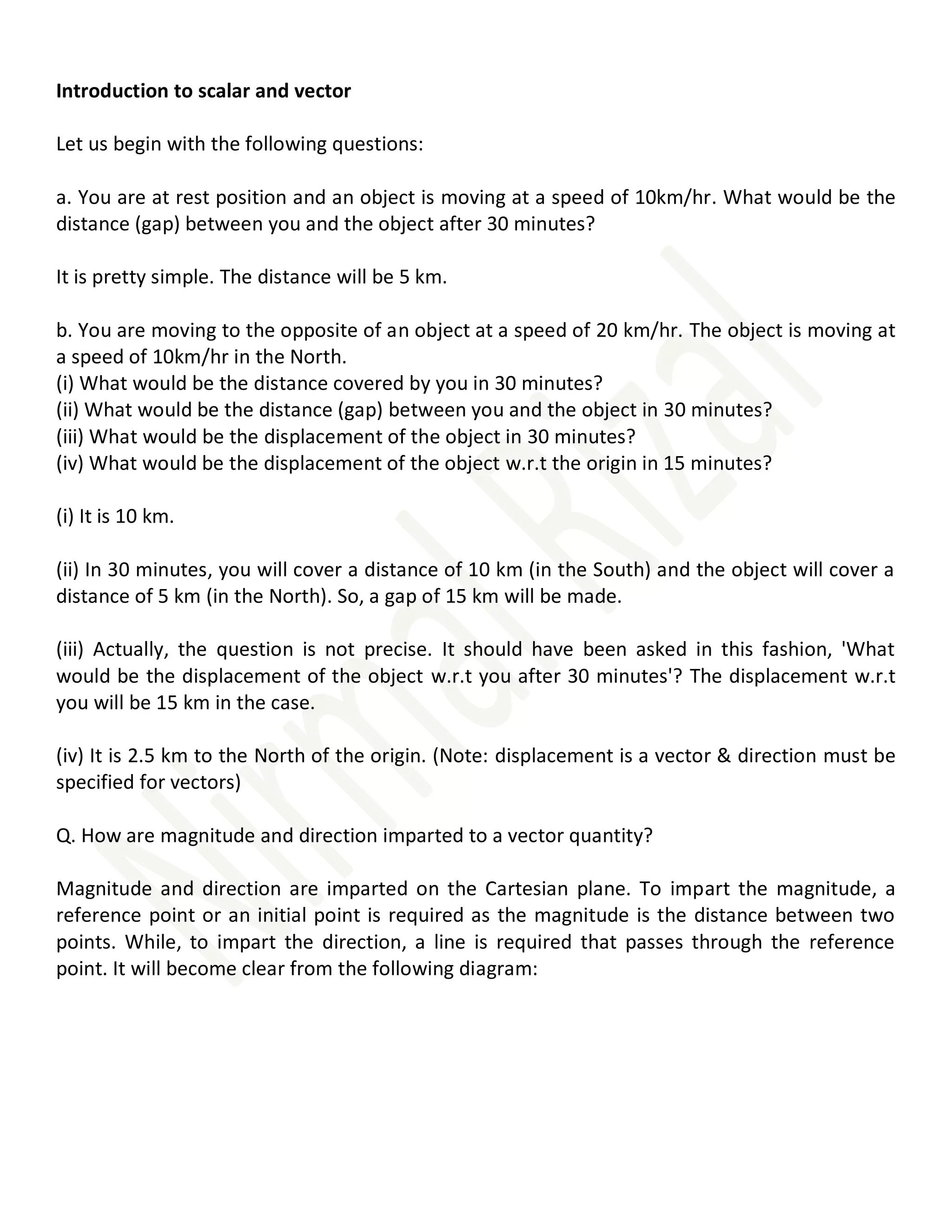The document explains the fundamental concepts of scalar and vector quantities, including their definitions, representations, and operations. It covers examples of calculating distances, displacements, and resultant forces through vector addition and resolution, underscoring the importance of direction in vector analysis. The document also discusses the relationship between different vector quantities and how to derive scalar products.