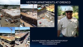 This document provides construction updates for the Vector Apartments project in Hillsboro, Oregon. The mixed-use development includes 2.5 levels of parking, storefronts, and office space. Construction began in June 2015 with timber framing, electrical, plumbing and other work. Updates include stormwater installation, excavation, framing of walls and stairs, concrete work, and ongoing rough-in of utilities.