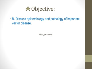 This document discusses several important vector-borne diseases including malaria, dengue fever, leishmaniasis, lymphatic filariasis (elephantiasis), African trypanosomiasis (sleeping sickness), and others. It describes the parasites and pathogens that cause each disease, their methods of transmission typically via arthropod vectors like mosquitoes and flies, characteristic symptoms, and global epidemiology. Malaria in particular is discussed in depth, outlining the four main plasmodium species that infect humans and how transmission is dependent on environmental factors like temperature. The clinical presentations of different forms of leishmaniasis are also reviewed.