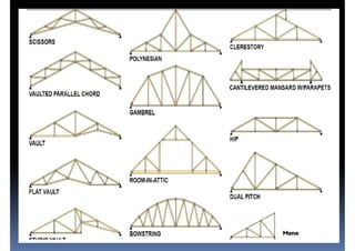 The document discusses vector structural systems, specifically trusses. It begins with introductions to vectors, trusses, and the evolution of vector structural systems. Trusses are composed of triangles for structural stability. Various truss types are then discussed, along with terminology used in trusses. Trusses work by transferring loads through tension and compression members arranged in triangular patterns. Historical examples of trusses and the theories behind how they function are also summarized.