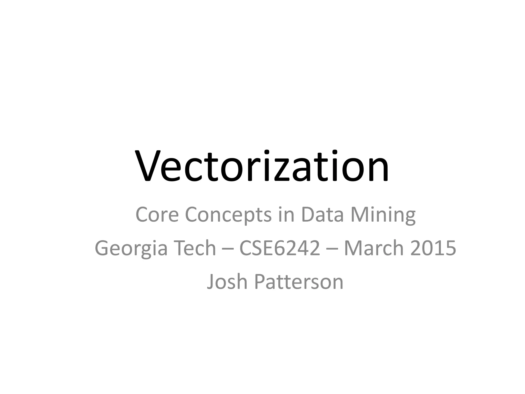 This document discusses vectorization, which is the process of converting raw data like text into numerical feature vectors that can be fed into machine learning algorithms. It covers the vector space model for text vectorization where each unique word is mapped to an index in a vector and the value is the word count. Common text vectorization strategies like bag-of-words, TF-IDF, and kernel hashing are explained. General vectorization techniques for different attribute types like nominal, ordinal, interval and ratio are also overviewed along with feature engineering methods and the Canova tool.