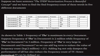 Vectorization is the process of converting words into numerical representations. Common techniques include bag-of-words which counts word frequencies, and TF-IDF which weights words based on frequency and importance. Word embedding techniques like Word2Vec and GloVe generate vector representations of words that encode semantic and syntactic relationships. Word2Vec uses the CBOW and Skip-gram models to predict words from contexts to learn embeddings, while GloVe uses global word co-occurrence statistics from a corpus. These pre-trained word embeddings can then be used for downstream NLP tasks.