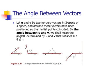 This document discusses vectors and their relationships in 2D and 3D space. It covers the dot product and how it can be used to determine the angle between two vectors. It also discusses properties of the dot product, orthogonal vectors, and using the dot product to find vector components. The document then covers planes in 3D space, including finding the point-normal equation of a plane and using vectors to write the equation of a plane. It provides examples of finding dot products, writing vector and parametric equations of planes and lines, and calculating distances between points and planes/lines.