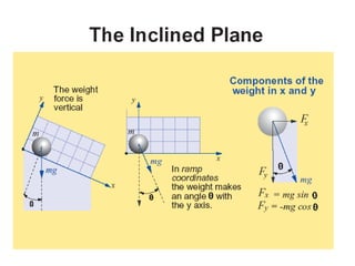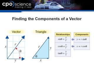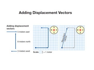 This chapter discusses vectors and their application to motion and forces. It covers adding and subtracting vectors, resolving vectors into components, projectile motion, and forces in two dimensions. The key topics are using vectors to describe changes in position, calculating vector components, determining the range of a projectile given an initial velocity vector, and using force vectors to solve two-dimensional equilibrium problems. Example problems demonstrate calculating vector magnitudes and components, adding velocity vectors, and analyzing vertical and horizontal motion of projectiles.