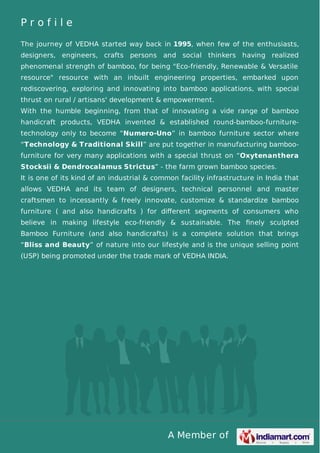 VEDHA is a non-profit organization established in 1995 that works with bamboo artisans in India. It explores bamboo applications and promotes sustainable bamboo products. VEDHA has invented round-bamboo furniture technology and manufactures a variety of bamboo furniture like chairs, tables, and beds. It also produces handicrafts and aims to empower local artisans while promoting an eco-friendly lifestyle.