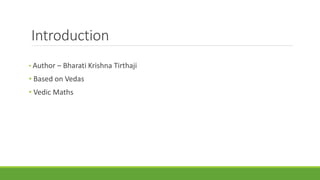 The document provides an introduction to Vedic mathematics, which is based on ancient Indian Vedic texts. It describes several Vedic mathematical formulas with examples, such as Ekadhikena Purvena for calculating squares, Nikhilam navatascaramam Dasatah for multiplication involving 9s, and Yavadunam Tavadunikrtya Varganca Yojayet for calculating squares close to bases of powers of 10. Algebraic proofs are also presented for some of the formulas. The document notes that Vedic math techniques can solve difficult math problems with high speed and accuracy, and represents just the beginning of applications of Vedic mathematics.