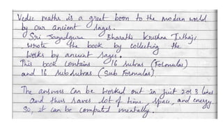 Vedic maths is a mathematical approach that emphasizes recognizing patterns and using shortcuts for problem-solving, allowing for one-line solutions instead of traditional step-by-step methods. It proves beneficial in academic settings as a verification tool and is particularly useful in competitive exams for quick calculations. Developed by an Indian mathematician in the early 20th century, Vedic maths encompasses 16 sutras and caters to varying educational levels from basic to advanced applications in fields like cryptography and machine learning.