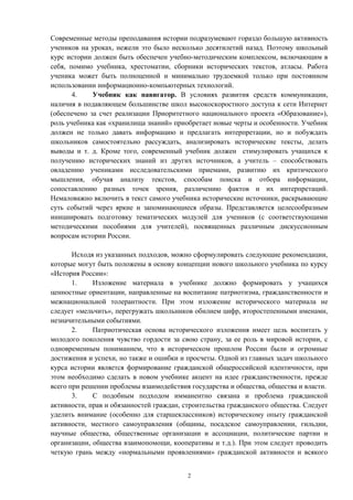 Документ описывает концепцию нового учебно-методического комплекса по истории России, акцентируя внимание на важности культурно-антропологического подхода к преподаванию, который должен учитывать многообразие граждан и исторические процессы на уровне простых людей. Предлагается добавить элементы социальной и культурной истории, улучшить методы преподавания и учить студентов критическому мышлению через активное взаимодействие с источниками. Важное внимание уделяется патриотизму, гражданской ответственности и культурным достижениям страны, подчеркивая необходимость интеграции истории религий и региональных особенностей в учебный процесс.