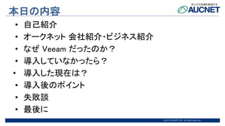All rights reserved 本日の内容 • 自己紹介 • オークネット 会社紹介・ビジネス紹介 • なぜ Veeam だったのか? • 導入していなかったら? • 導入した現在は? • 導入後のポイント • 失敗談 • 最後に