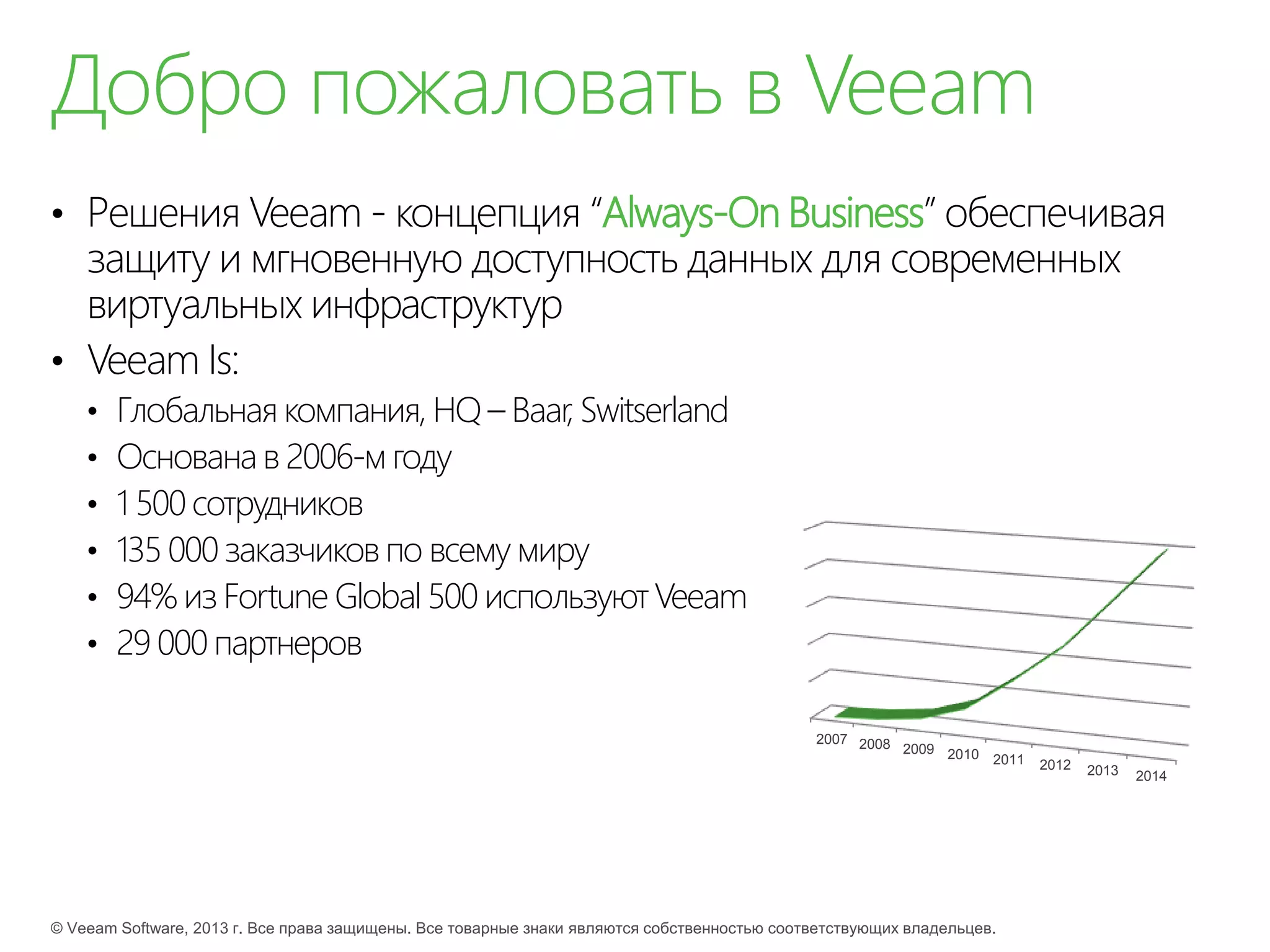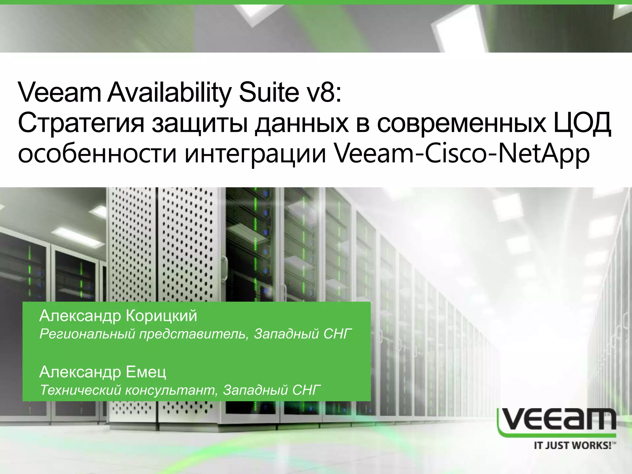Документ описывает решения Veeam Availability Suite v8 для защиты данных в современных центрах обработки данных, акцентируя внимание на интеграции с Cisco и NetApp. Подчеркиваются возможности для обеспечения непрерывного бизнеса и мгновенного восстановления данных с минимальным временем восстановления. Также приведены данные о компании Veeam, включая ее глобальное присутствие и клиентскую базу.
