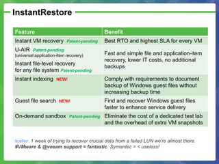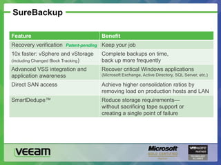 The document discusses Veeam Backup & Replication software. It highlights issues with traditional backup methods for virtual machines, and outlines how Veeam provides a better solution through image-based backups, changed block tracking, deduplication, and features like instant recovery and recovery verification. The document shares customer testimonials and details of Veeam's product roadmap to showcase its reliability and value for backing up virtual environments.