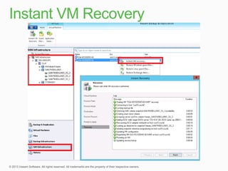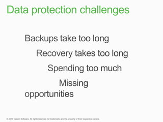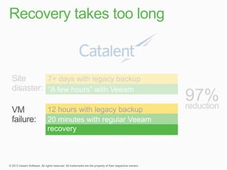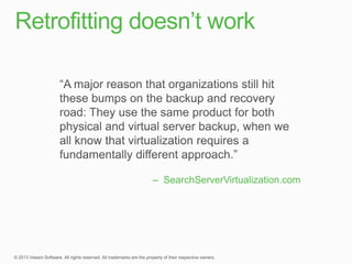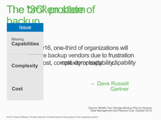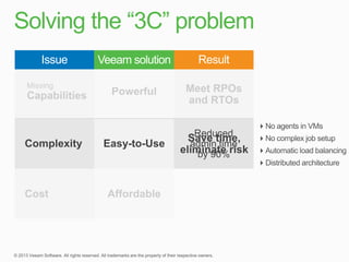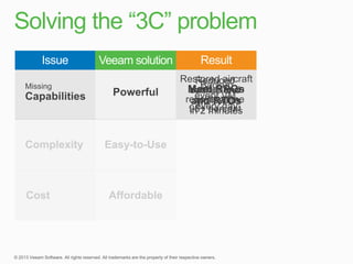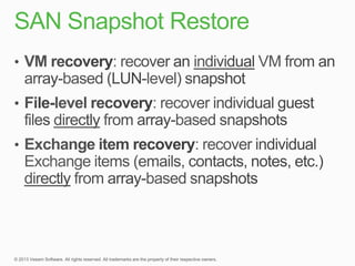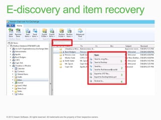 This document describes traditional backup methods for Exchange Server that require expensive agents, staging backups in a separate location, and a multi-step restore process. It then outlines Veeam's direct-SAN-access backup method that is 80x faster, uses built-in compression and deduplication, and allows restores to be completed within 3 minutes without agents or a staging area.