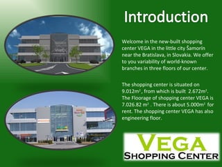 The document introduces the new VEGA shopping center located in Šamorín, Slovakia near Bratislava. The three floor shopping center totals 7,026 square meters of rentable space and was built to improve quality of life for local citizens and provide entertainment options. It aims to boost the local economy by creating new jobs. The city of Šamorín has existed along the Danube River since the 17th century.