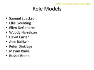 The document provides information about veganism including role models, recipes from different cuisines, products, myths about vegan diets, the environmental benefits, tips for eating and shopping as a vegan, the health benefits, why vegans don't eat animals, vegan athletes, campaigns against animal cruelty, and vegan clothing materials. Primary research was also included where college students answered questions about what being vegan means to them and if they would try it and what they would miss.