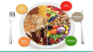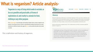 Veganism is defined as avoiding all animal products including meat, dairy and eggs. This document discusses the definition and history of veganism as well as the health benefits of a vegan lifestyle such as reduced risk of heart disease and type 2 diabetes. Research on vegan diets preventing various cancers and diseases is also presented. The document then discusses what a balanced vegan diet entails and ensuring adequate intake of vitamins B12 and D through fortified foods or supplements. Lastly, climate change impacts of animal agriculture are covered, noting it accounts for 51% of greenhouse gas emissions globally.