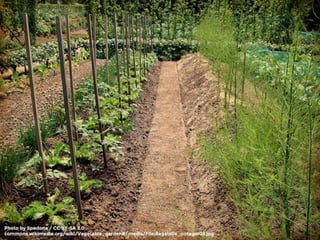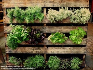 This document provides ideas and guidelines for different vegetable garden designs including traditional in-ground rows, food forests, raised beds, hugelkultur, straw bale gardens, square foot designs, keyhole designs, plant pyramids, step gardens, curved beds, container gardening, hanging gardens, vertical gardens, teepee trellises, hydroponics, planting by color, and mixing designs. It also outlines factors to consider when planning a garden such as plant selection, sunlight, water access, companion planting, ease of maintenance, and materials.