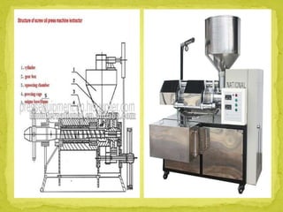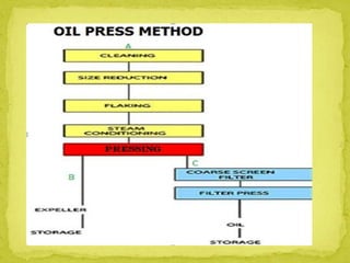 Vegetable oils are extracted from various plant sources such as seeds, nuts, and fruits. They are commonly used for cooking, fuel, and industrial purposes. The key types of vegetable oils include palm, soybean, canola, and sunflower oils. Vegetable oils have different properties depending on their fatty acid composition, with coconut oil being highly saturated and canola/sunflower oils being less saturated but higher in monounsaturated fat. They are produced through pressing or solvent extraction methods and have varying smoke points for cooking.