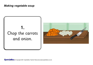 The document provides instructions for making vegetable soup. It lists the ingredients as 2 tbsp olive oil, 110g carrots, 110g peas, 2 tbsp tomato puree, and 1 1/2 pt vegetable stock. The instructions specify chopping the carrots and onion, heating the olive oil in a pan, cooking the onion until soft, adding the carrots, peas and tomato puree, pouring in the vegetable stock and cooking, and then serving the soup into bowls. It also contains copyright information noting that the resource can be used personally or for the classroom but cannot be distributed without permission.