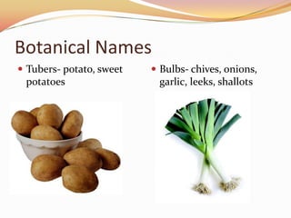 This document discusses different types of vegetables categorized by their botanical parts - tubers, bulbs, roots, stems, leaves, seeds, flowers and fruits. It describes their flavors, nutrient contents in terms of water, starch, vitamins and minerals. The document provides guidance on selection, buying, storage and cooking methods of vegetables to best retain their colors, flavors, textures and nutrients. It emphasizes cooking vegetables in small amounts of water for short periods of time to minimize nutrient loss.