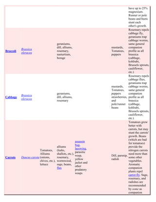 Vegetables Companion Planting Guide provides information on how to plant different vegetables together to help or hinder pests. Alliums such as onions help fruit trees, nightshades and brassicas, and are helped by carrots. Brassicas help potatoes and cereals, and are attracted to by beneficial insects but avoided by mustards and nightshades. Beans help corn and spinach, and are attracted to by beneficial insects but avoided by tomatoes, chili peppers and alliums.