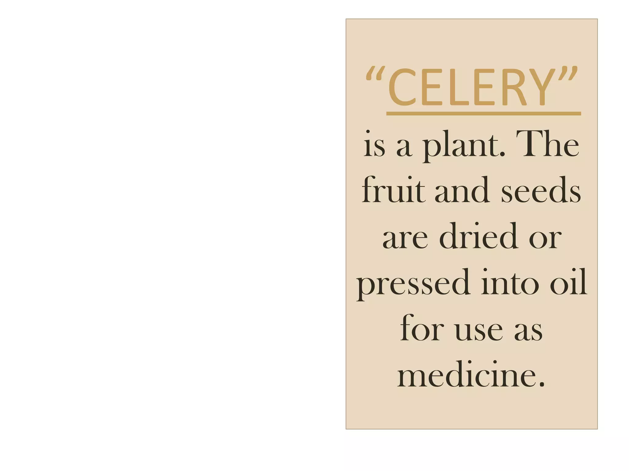 The document discusses the benefits and contraindications of celery. It notes that celery is a plant whose fruit and seeds can be dried or pressed into oil for use as medicine. Some benefits include calming nerves, treating food cravings, insomnia, digestive issues, and cough. However, it should be avoided in large quantities by those with kidney issues, bladder inflammation, or during pregnancy as it can cause abortion.