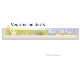 This document discusses types of vegetarian diets including strict vegetarian, lacto vegetarian, and lacto ovo vegetarian. Reasons for becoming vegetarian include religion, ethics, health, cost, and lifestyle. Potential dietary issues for vegetarians include lack of protein, vitamins B1, B2, niacin, B12, vitamin A, and iron. Guidelines for vegetarian meals recommend sources of protein, calcium, iron, and vitamin B12 from foods like legumes, nuts, cereals, fortified foods, broccoli, and spinach. Meal planning suggestions include using soy milk, tofu, vegetable spreads, and oils instead of animal products and including portions from the vegetarian food pyramid.