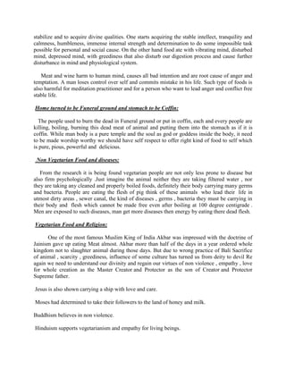 The document advocates for a vegetarian lifestyle rooted in compassion and empathy towards all living beings, emphasizing the moral obligation to protect animals from suffering and extinction. It critiques humanity's hypocrisy in justifying violence against animals and highlights the health benefits of vegetarianism, asserting that plant-based diets result in greater psychological and physical well-being. The text also calls for a spiritual awakening to bridge the gap between ethical principles and personal practices, urging humans to remember their role as caretakers of the planet and all its creatures.