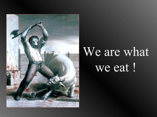 The document discusses the health benefits of a vegetarian diet compared to a meat-eating diet. It analyzes the anatomical differences between humans and carnivores/herbivores and argues that humans are more similar to herbivores. It also discusses the environmental impacts of industrial meat production and the cruelty involved in modern animal agriculture. Famous vegetarians and quotes from spiritual leaders are provided to support adopting a vegetarian lifestyle.