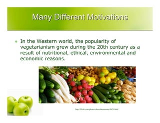 Vegetarianism has grown in popularity in the Western world for several reasons, including health, ethics, and environmental concerns. A 2002 poll found that the most common reasons Americans choose a vegetarian diet are health-related, such as not wanting to eat meat with chemicals or hormones. Vegetarian diets are associated with lower risks of chronic diseases and lower medical costs. Vegetarians also typically have lower body mass indexes and cholesterol levels than non-vegetarians. Choosing a vegetarian lifestyle can help reduce animal suffering and environmental impacts such as water usage and pollution.