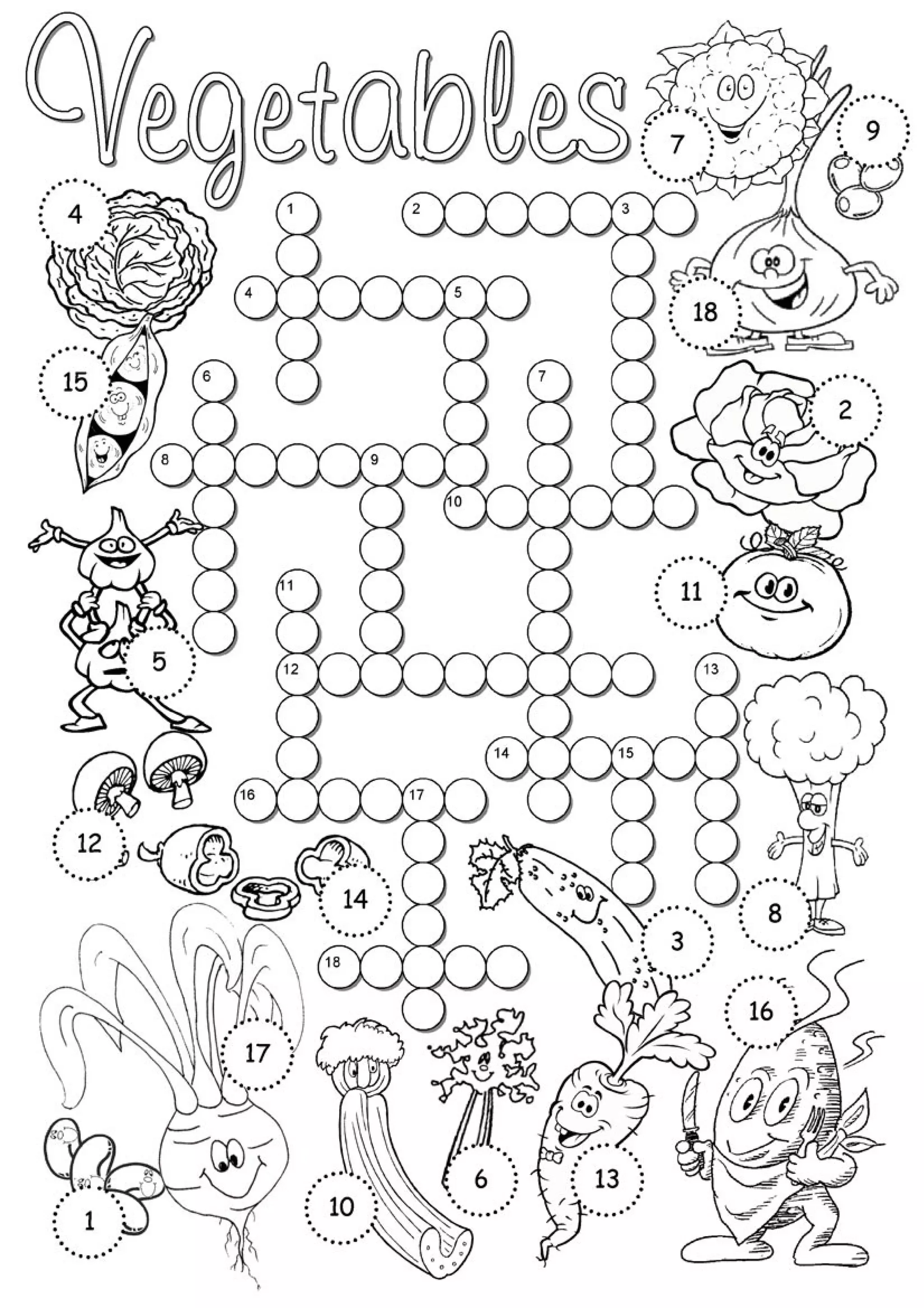 This document appears to be a crossword puzzle containing words related to vegetables. The crossword contains 18 squares with letters going across and down containing clues to vegetables such as parsley, beans, tomatoes, olives, turnip, garlic, cauliflower, cucumber, peas, and carrots.